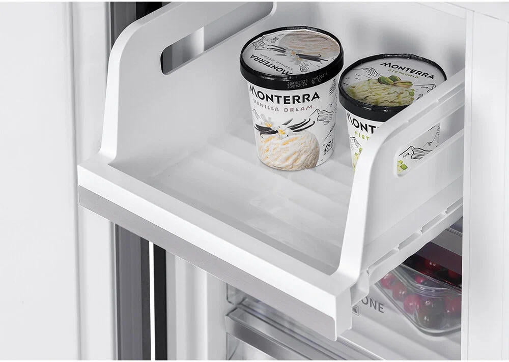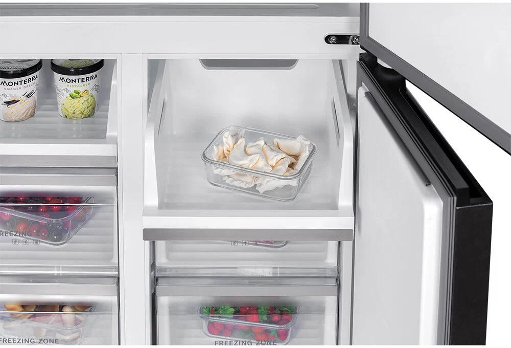 Мембранная технология автоматического поддержания уровня влажности до 90%. В интеллектуальном режиме управления температура внутри холодильника настраивается автоматически. Ящики в холодильной камере выдвижные на направляющих. Один из ящиков в холодильной камере имеет гибкую настройку температуры, где можно выбрать один из предустановленных режимов: напитки, мясо или фрукты.