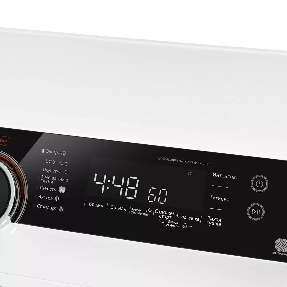 За комфорт и долговечность отвечает инверторный двигатель, снижающий шум до 66 дБ и износ узлов. Удобное сенсорное управление с информативным дисплеем облегчает настройку параметров — можно изменять температуру в диапазоне 20–70 °C и сохранять любимые настройки в «Моём режиме». Внутренняя подсветка помогает контролировать процесс, а режим «Без складок» сокращает время на глажку.