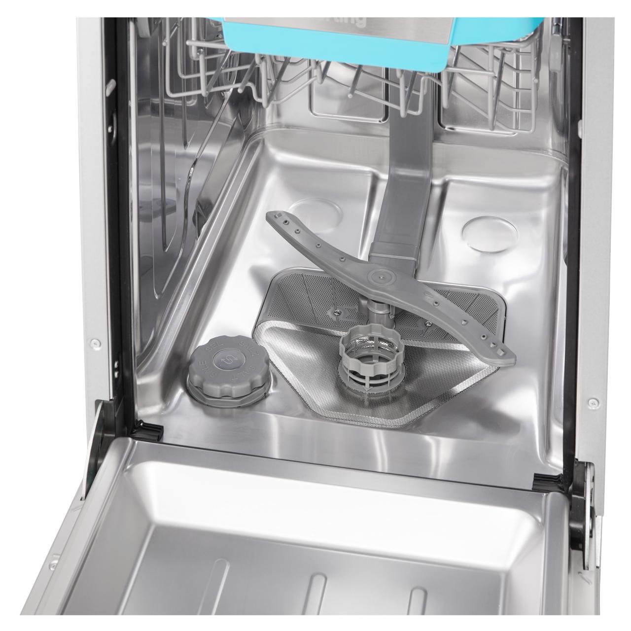 Встраиваемая посудомоечная машина Korting KDI 45977 представляет собой уникальное сочетание стильного дизайна и передовых технологий. Серебристая панель управления и внутреннее освещение LED придают ей современный и элегантный вид.