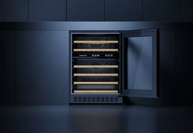 Внутреннее пространство объемом 158 литров разделено на две независимые температурные зоны: верхний сегмент настраивается от 5 до 18 °C, нижний — от 12 до 20 °C, что идеально подходит для одновременного хранения белых, красных и розовых вин при оптимальной для каждого сорта температуре. Шкаф вмещает до 46 бутылок объемом 0.75 л, размещенных на 6 деревянных выдвижных полках. Светодиодное освещение деликатно подсвечивает коллекцию, а вентиляция обеспечивает равномерную циркуляцию воздуха. Компрессорное охлаждение с автоматической системой размораживания гарантирует стабильную работу и надежность. Тонированное стекло с защитой от УФ-излучения предохраняет вина от вредного воздействия света. Электронное управление с цифровым дисплеем обеспечивает точный и удобный контроль температуры. Модель оснащена световой и звуковой индикацией неисправностей. Низкий уровень шума 38 дБ и годовое энергопотребление 99 кВт·ч (класс F) делают эксплуатацию комфортную и экономичную. Климатический класс N-ST гарантирует адаптивность к различным условиям. Производство — Германия.