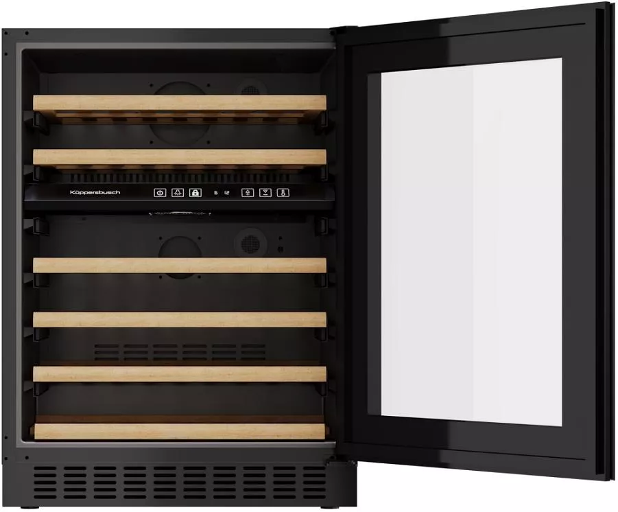 Встраиваемый винный шкаф Kuppersbusch FWKU 1851.0 S — это стильное и вместительное решение для хранения и созревания вин, созданное для ценителей качества и элегантности. Модель выполнена в черном стекле с элегантной черной рамкой, что придает ей современный и изысканный вид. Скрытая ручка не нарушает гармоничность внешнего облика, а возможность перенавешивания двери позволяет легко адаптировать установку под планировку помещения. Высота корпуса регулируется в пределах 81,5–88,5 см, ширина 59,5 см, глубина 57 см. Для установки под столешницу предусмотрена съемная вентиляционная решетка.